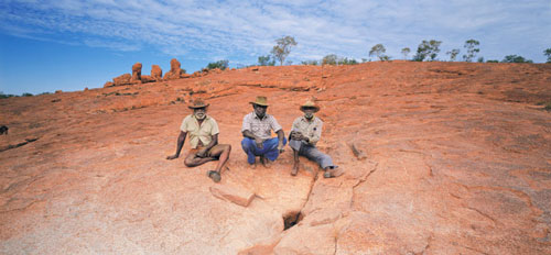 Dinny Nolan Tjampitjinpa, Don Morton Japangardi and Frankie Japanangka, Yuellamu, Northern Territory - 16x10 inches (40.6x27cm) unframed