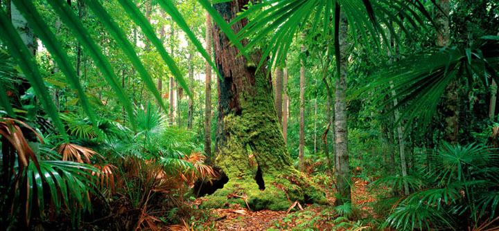 A dead forest giant hollowed by an ancient fire is now surrounded by a rainforest of cabbage palms and coachwood.