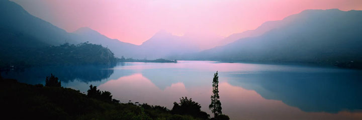 Nestled at the base of Cradle Mountain in the Tasmanian wilderness, Lake Dove glows under the pinkish haze of smoke from nearby bushfires.