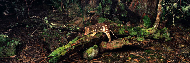 Australia's largest mainland marsupial carnivore explores the forest floor at dusk. Although suited to an arboreal existence, time is spent foraging at ground level where they often track on fallen logs.